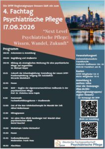 Die DFPP Regionalgruppe Hessen lädt herzlich zum 4. Fachtag Psychiatrische Pflege ein! Unter dem Motto “Next Level Psychiatrische Pflege: Wissen, Wandel, Zukunft” werfen wir am 17. Juni 2026 einen gemeinsamen Blick auf die kommenden Herausforderungen und Innovationen unseres Fachbereichs.
