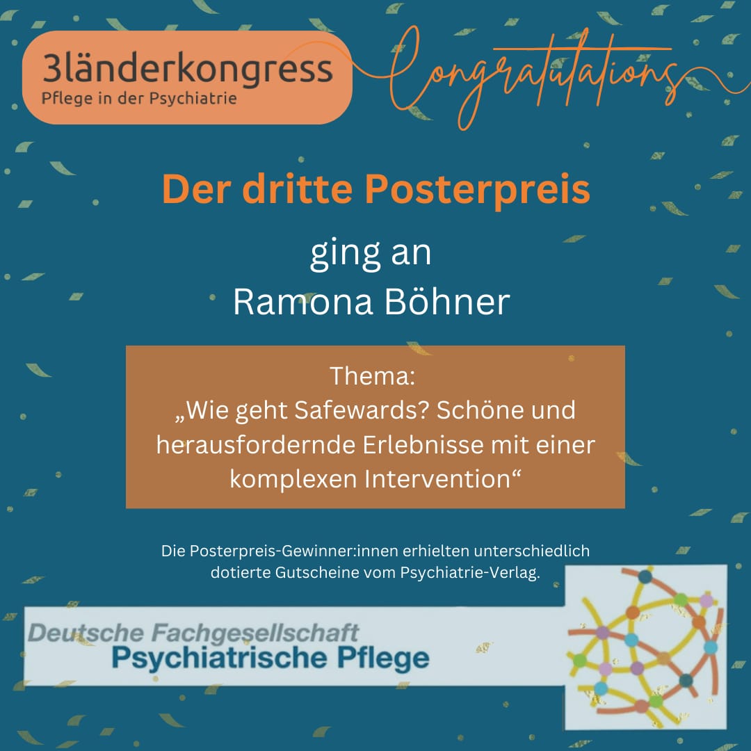 - Der dritte Posterpreis ging an Ramona Böhner für das Poster „Wie geht Safewards? Schöne und herausfordernde Erlebnisse mit einer komplexen Intervention“.Posterpreise: Die Posterpreis-Gewinner*innen erhielten unterschiedlich dotierte Gutscheine vom Psychiatrie-Verlag.