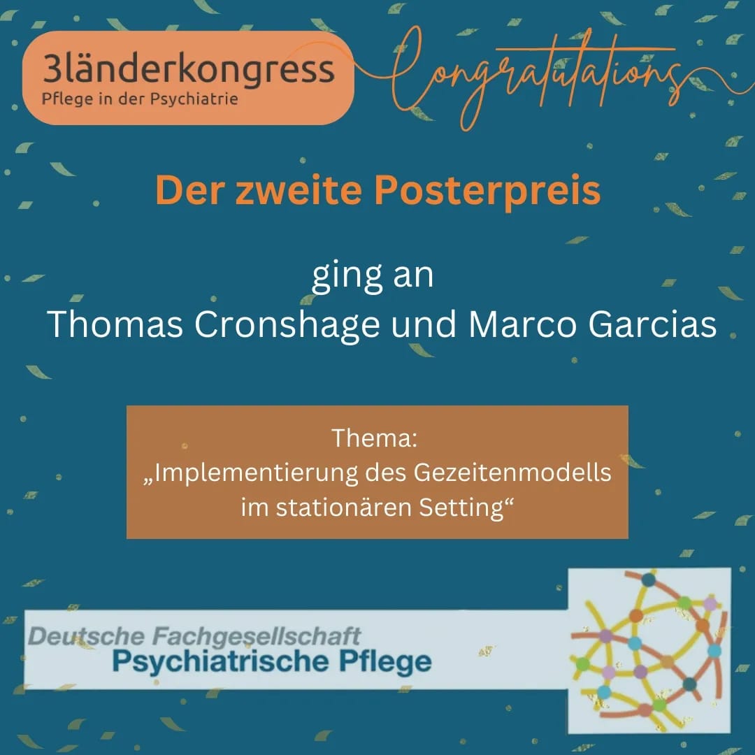 - Den zweiten Posterpreis erhielten Thomas Cronshage und Marco Gardias für das Poster „Implementierung des Gezeitenmodells im stationären Setting“