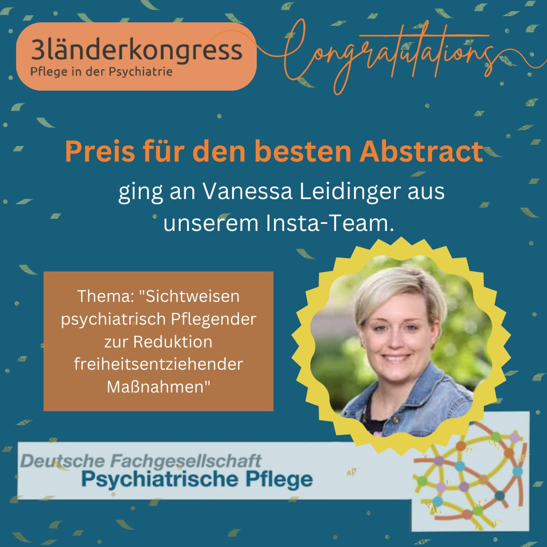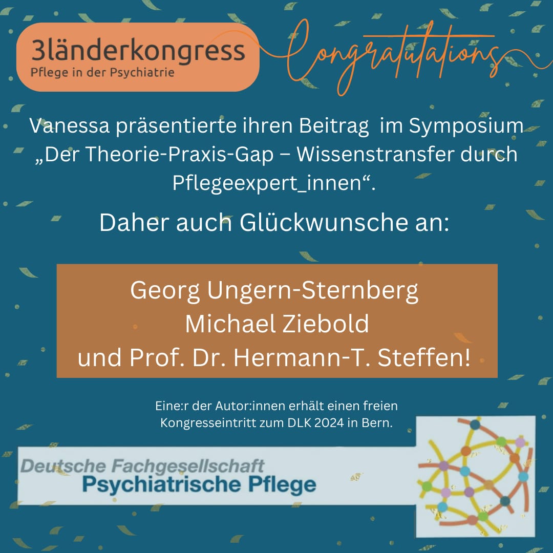 - Das beste Abstract wurde von Vanessa Leidinger eingereicht. Das Abstract zum Symposium „Der Theorie-Praxis-Gap – Wissenstransfer durch Pflegeexpert_innen“ wurde von Georg von Ungern-Sternbern, Vanessa Leidinger, Michael Ziebold und Hermann-T. Steffen verfasst.Preis: Eine*r der Autor*innen erhält einen freien Kongresseintritt zum DLK 2024 in Bern.