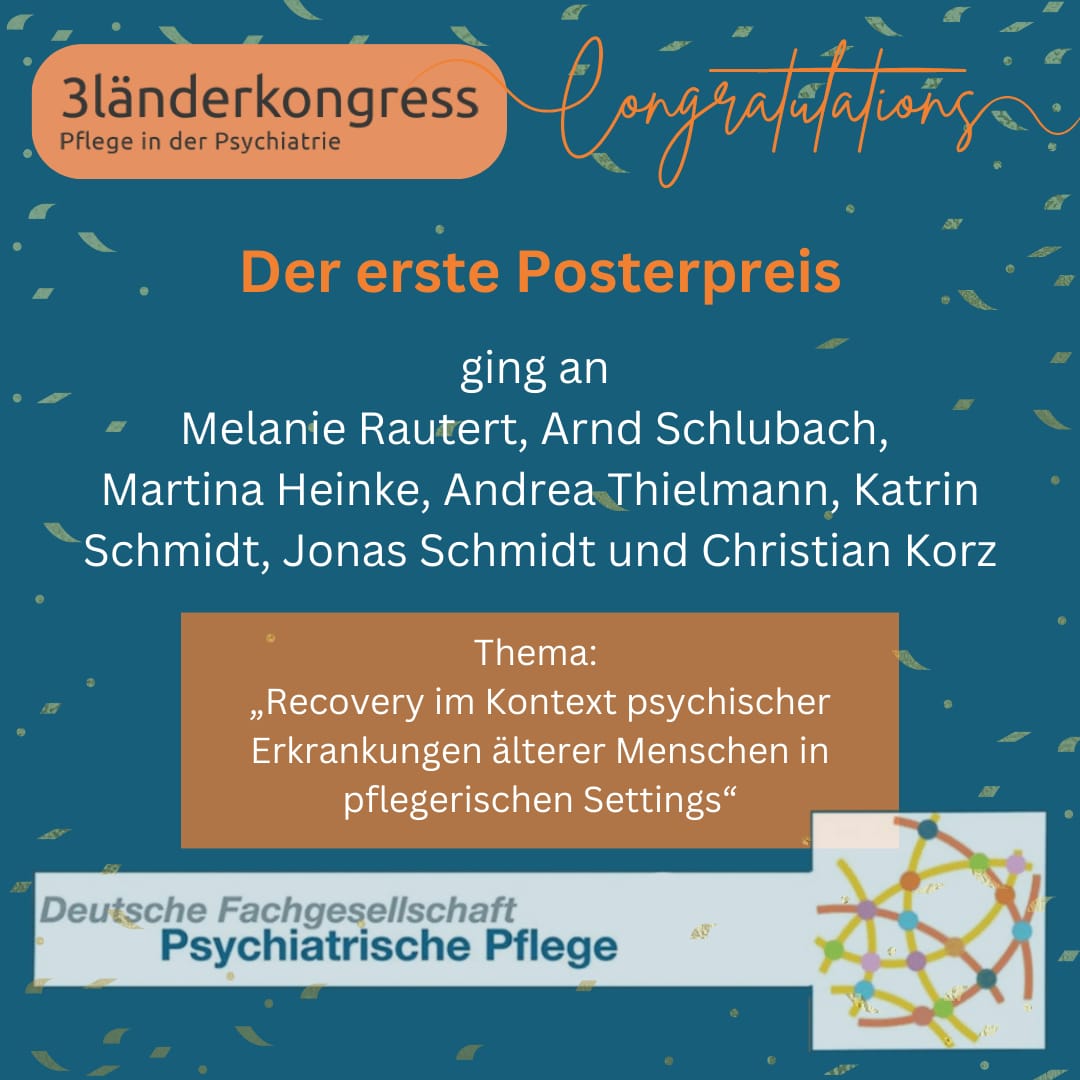 - Der erste Posterpreis wurde für das Poster „Recovery im Kontext psychischer Erkrankungen älterer Menschen in pflegerischen Settings“ an Melanie Rautert, Arnd Schubach, Martina Heinke, Andrea Thielmann, Katrin Schmidt, Jonas Schmidt und Christian Korz vergeben.